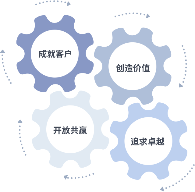 成就客户是一切决策的出发点,创造价值是衡量所有工作的标准,追求卓越是EMC易倍做事做人的态度,开放共赢是EMC易倍的格局也是最终的结果。价值观的齿轮环环相扣,推动着组织里的每个人不断向前。